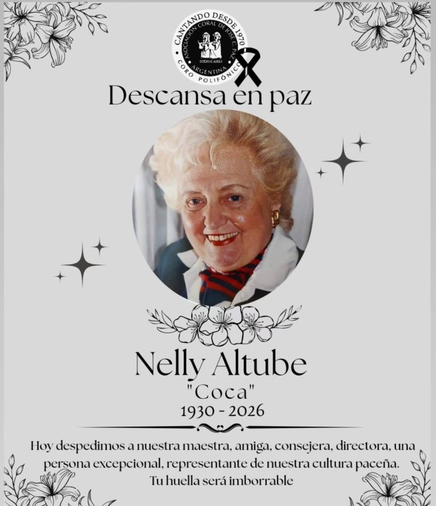 La figura de Nelly “Coca” Altube deja un legado sólido en la cultura y la memoria de José C. Paz, donde su trabajo seguirá resonando en cada voz coral y en cada espacio comunitario que ayudó a construir.