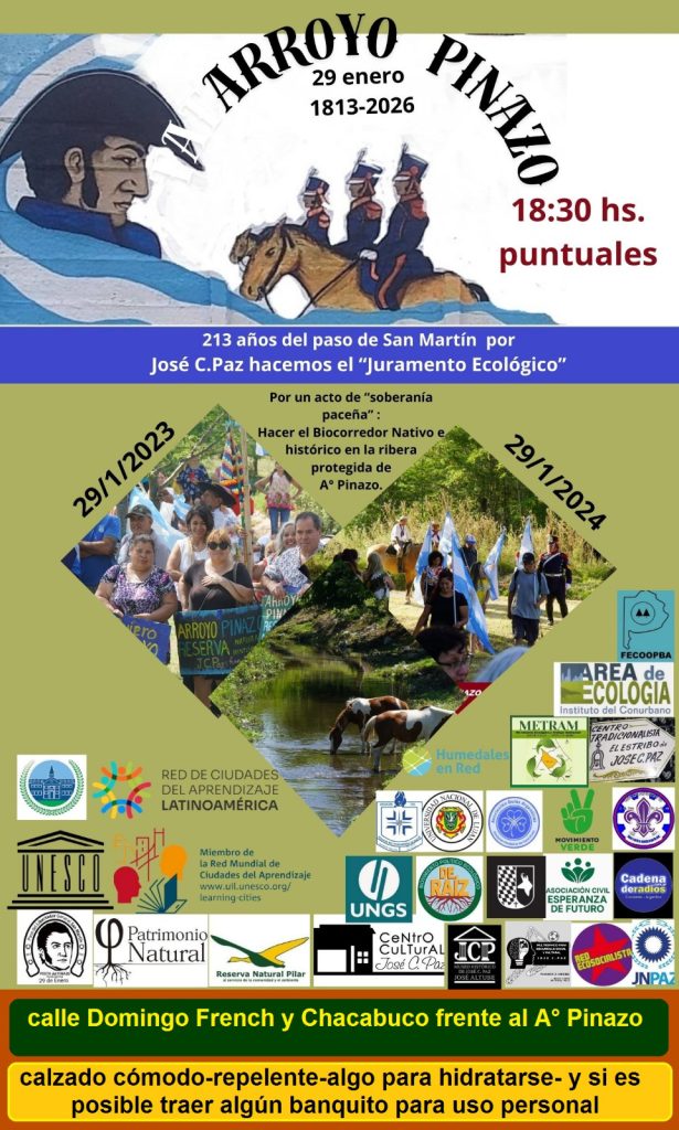 El Movimiento Ecológico Trabajo Ambiental de José C. Paz invita a la comunidad a participar del Homenaje a San Martín, que se llevará a cabo el 29 de enero a las 18:30 en la intersección de las calles Domingo French y Chacabuco, frente al Arroyo Pinazo. La conmemoración se realiza al cumplirse 213 años del paso del General San Martín y sus Granaderos por la Posta Pinazo, camino al histórico Combate de San Lorenzo.